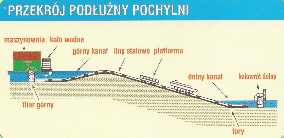Le câble entraînant son wagonnet sur un rail parcourt la rampe entre les 2 extrémités du canal.